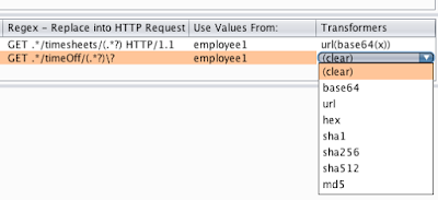 Chain transformers can be stacked on top of each other to modify the data in whatever way is required by the application. Supported transformers in AuthMatrix 0.8 include: Base64, URL, Hex, SHA1, SHA256, SHA512, and MD5.